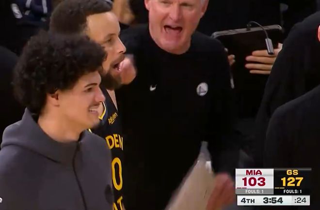 末节库里在场下休息,希尔德与波杰两人带队拉开到24分打崩热火。