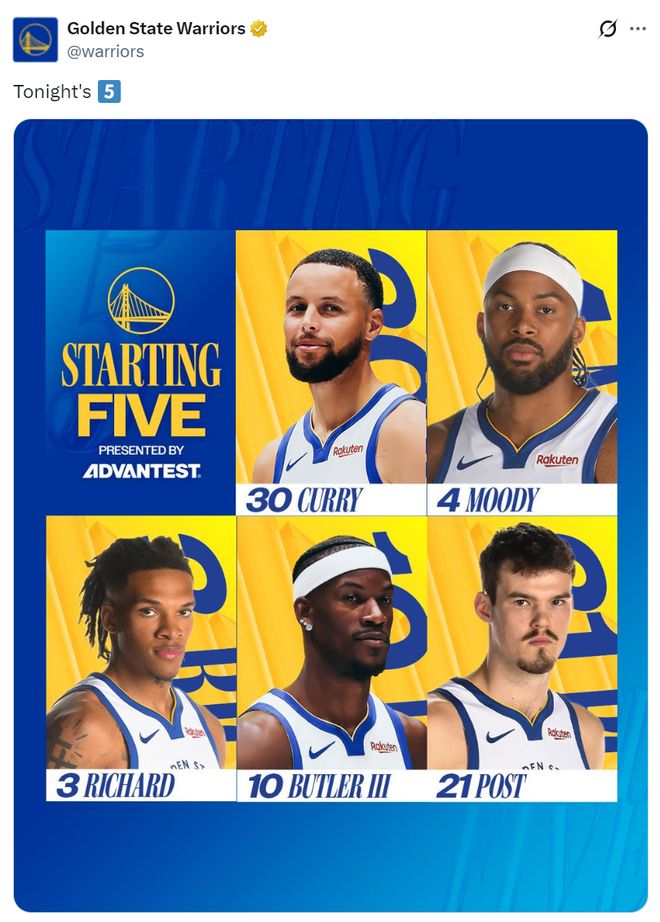 勇士:库里、穆迪、理查德、巴特勒、波斯特;