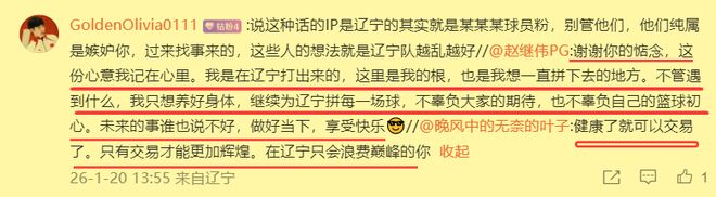值得一提的是,对于添乱网友的不实猜测,辽篮队长赵继伟毫不客气地进行了驳斥。他说虽然以后的事谁也说不谁,但是任何时候他都绝对不会忘根、忘本,永远怀揣着一颗感恩的心,想一直为自己的母队辽篮拼下去。