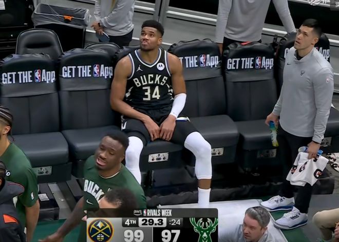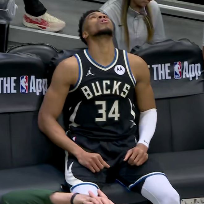 然后比赛最后时刻,字母哥受伤了,结果坐在板凳席上的他拿毛巾捂着脸,非常的痛苦和沮丧,看着好像球队输球导致他很难受一样。可实际上他难受并不是因为球队输了,而是因为他自己受伤了,很可能交易不掉了,这才是字母哥满脸不爽的真正原因。
