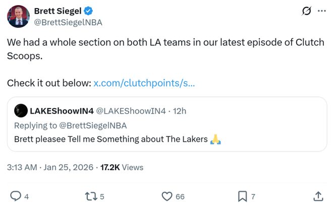 消息来自于美媒《clutchpoints》名记Brett Siegel,他在社媒与球迷互动期间,回答了有关湖人队补强计划的问题。
