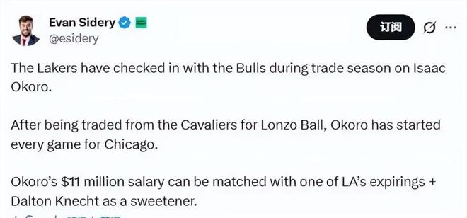 奥科罗则是更加靠谱的选择,美记Evan Sidery此前也曝出湖人已经向公牛队询价,希望围绕克内克特+到期合同作为核心筹码追求奥科罗。