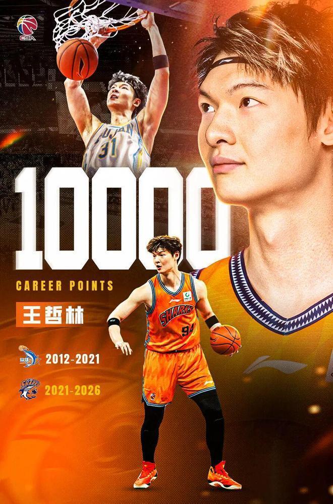 上海队主场大胜广州龙狮队,这场比赛上海队的王哲林替补出场24分38秒,投篮15投12中拿到25分10篮板1助攻的数据,这场比赛过后王哲林CBA职业生涯常规赛的总得分超过了10000分,成为CBA第6位万分先生,其他5人分别是哈德森13076分、易建联12781分、琼斯11848分、朱芳雨11165分、刘炜10147分。本赛季王哲林场均得分12.0分7.2个篮板1.3次助攻,预计在本赛季结束之前就可以超过刘炜,来到CBA历史得分榜第5位。