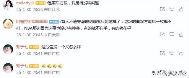 有球迷吐槽说道:“有人不遵守潜规则那就只能这样了,垃圾时间双方最后一攻都不打,NBA那边因为这事也没少有冲突,有的就不在乎,有的就在乎”。