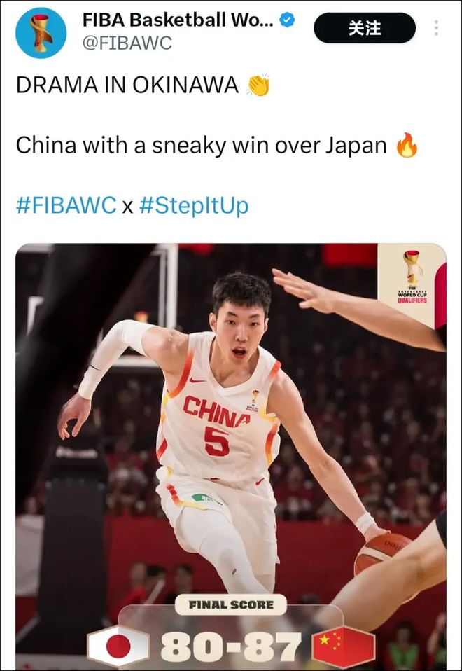目前FIBA官方已经将该帖文案修改为:“冲绳神剧本!中国男篮在下半场翻盘,击败日本队。”