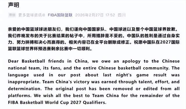 “我们谨向中国男篮国家队、中国球迷以及整个中国篮球界致歉……中国男篮的胜利是通过自身实力、努力拼搏和决心而赢得。”