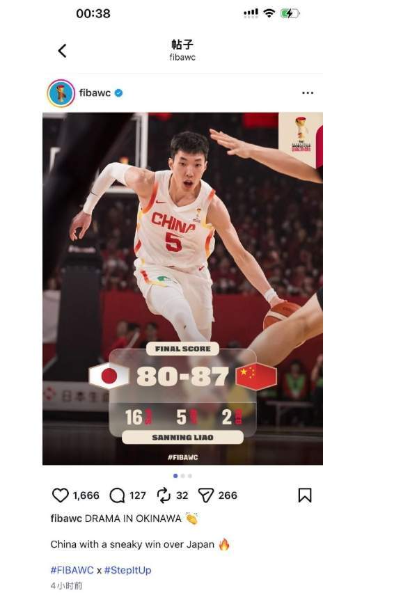 可赛后,FIBA官方社媒发了一条推文:“China with a sneaky win over Japan”。