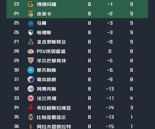 此外巴黎与纽卡原本都是同积13分,末轮2队直接交锋,结果却打成了1:1,同时跌入到附加赛区。国米虽然在客场击败了多特蒙德,但此前三连败的大坑让他们最终只能以第10名的成绩参加淘汰赛附加赛。亚特兰大和尤文末轮同样未能赢球,同样需要去参加附加赛;而最丢人现眼就是意甲冠军那不勒斯了,他们在末轮主场输给切尔西之后位列第30,堂堂意甲联赛卫冕冠军因此直接被淘汰出局;孔蒂再次立住了自己不会踢欧战的人设。